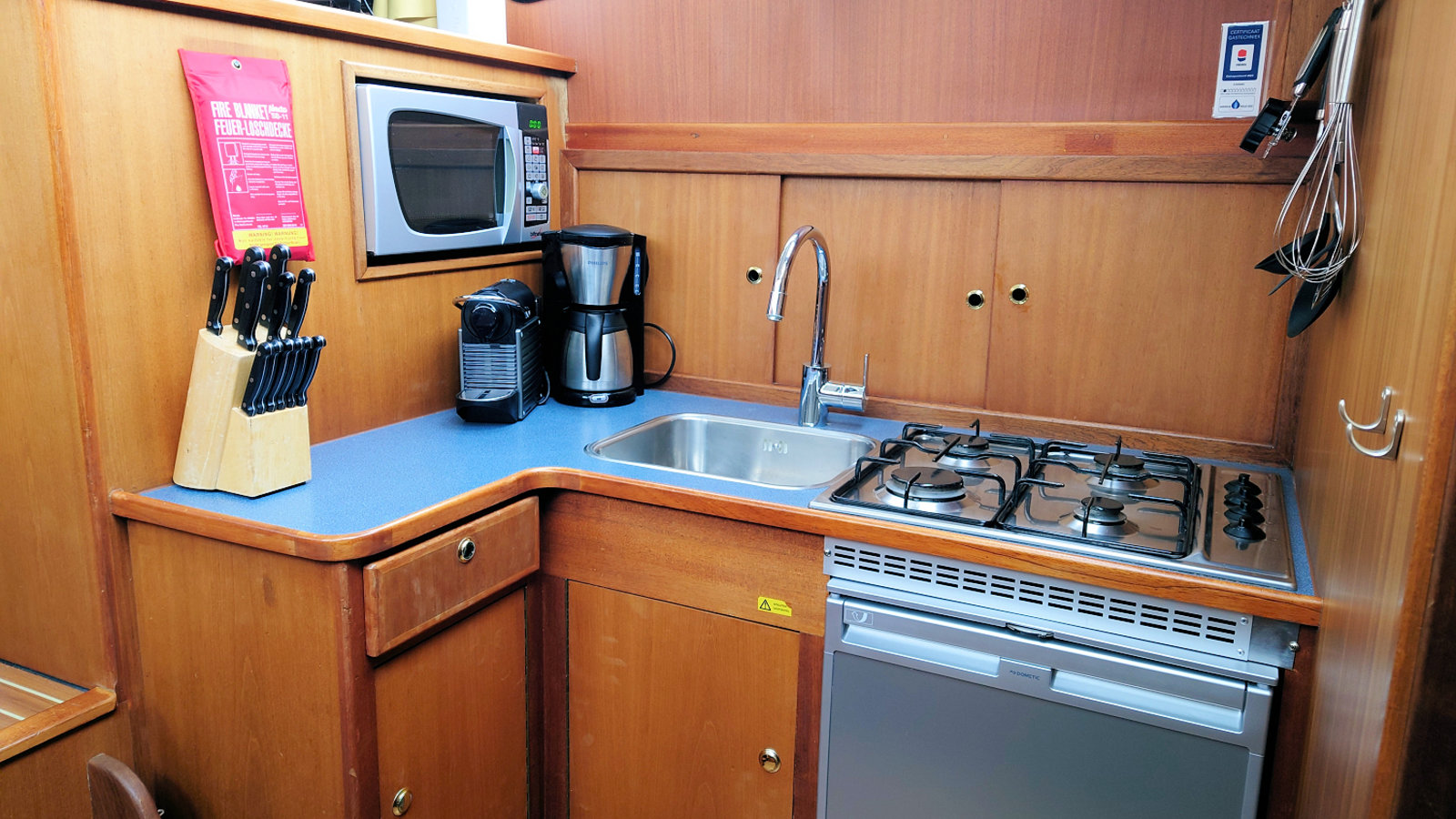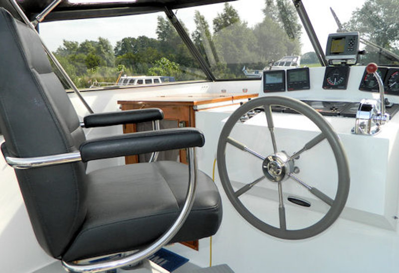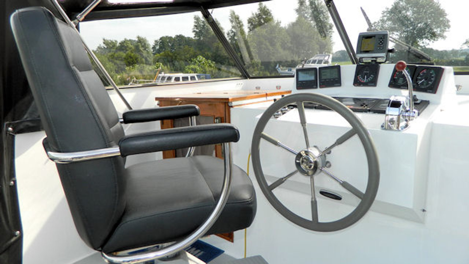 Die Yacht verfügt über kräftige, hydraulische Bug- und Heckschrauben. Auch die Steuereinrichtung ist hydraulisch: Sie fahren also „leicht wie eine Feder“.