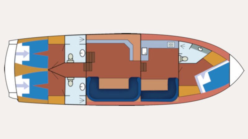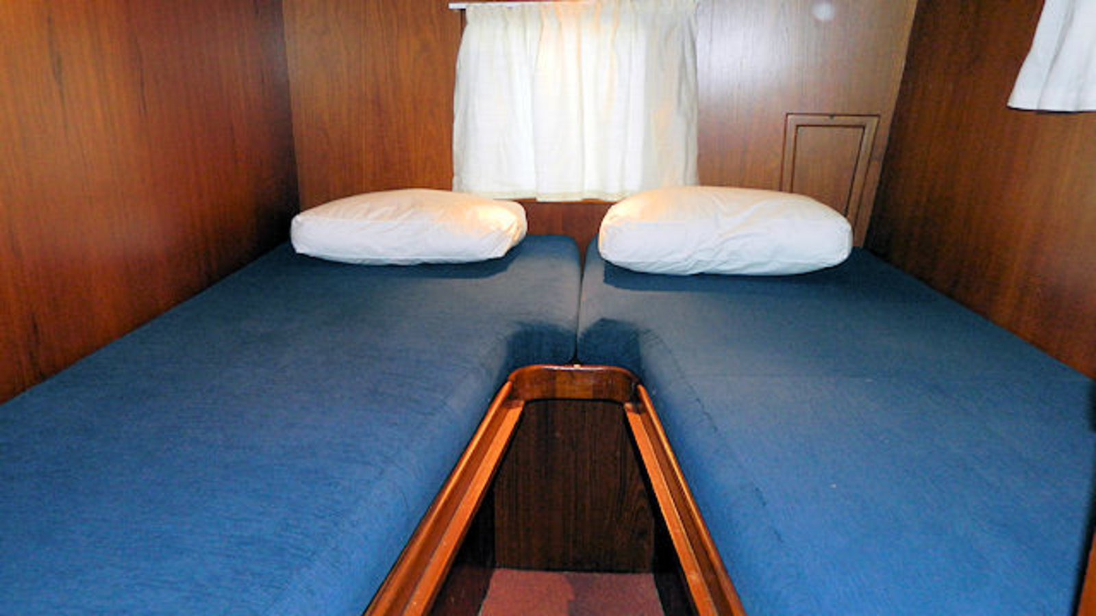 Dieses Boot ist geradezu ideal für Personen, die großen Wert auf Privatsphäre legen. Die Betten (Länge ca. 2 Meter, Breite ca.1.70 Meter) der hinteren Kabinen können jeweils in ein großes Doppelbett (ca. 2 Meter x ca. 2 Meter) verwandelt werden.