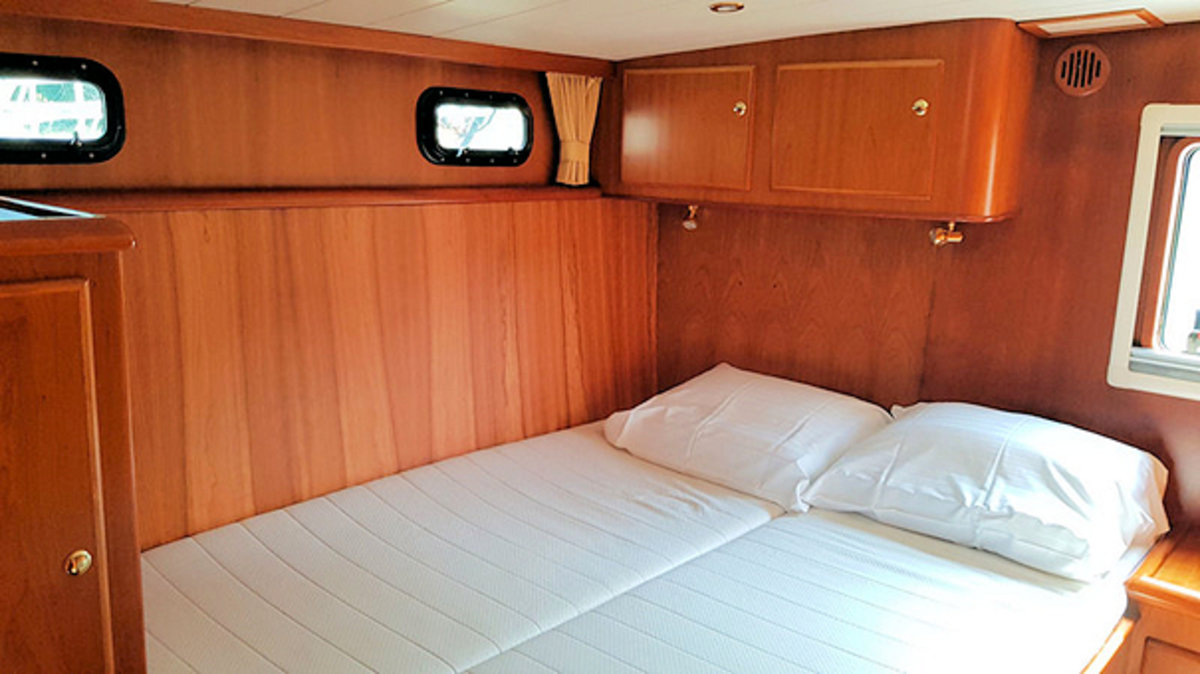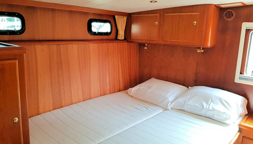 Die Achterkabinen haben jeweils ein Doppelbett, während in der Schlafkabine in der Spitze zwei Einzelbetten für einen guten Schlaf sorgen.