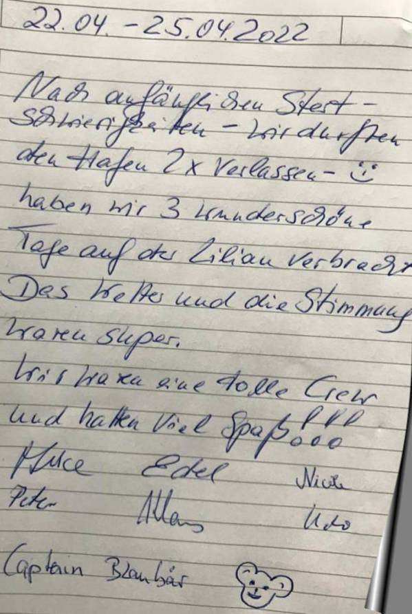 Nach anfänglichen Start- Schwierigkeiten – wir durften den Hafen 2x verlassen-haben wir 3 wunderschöne Tage auf der Lilian verbracht.