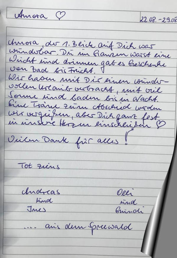 Wir haben mit Dir einen wundervollen Urlaub verbracht, mit viel Sonne und Baden bis in Nacht. Eine Träne zum Abschied werden wir vergießen, aber Dich ganz fest in unsere Herzen einschließen.