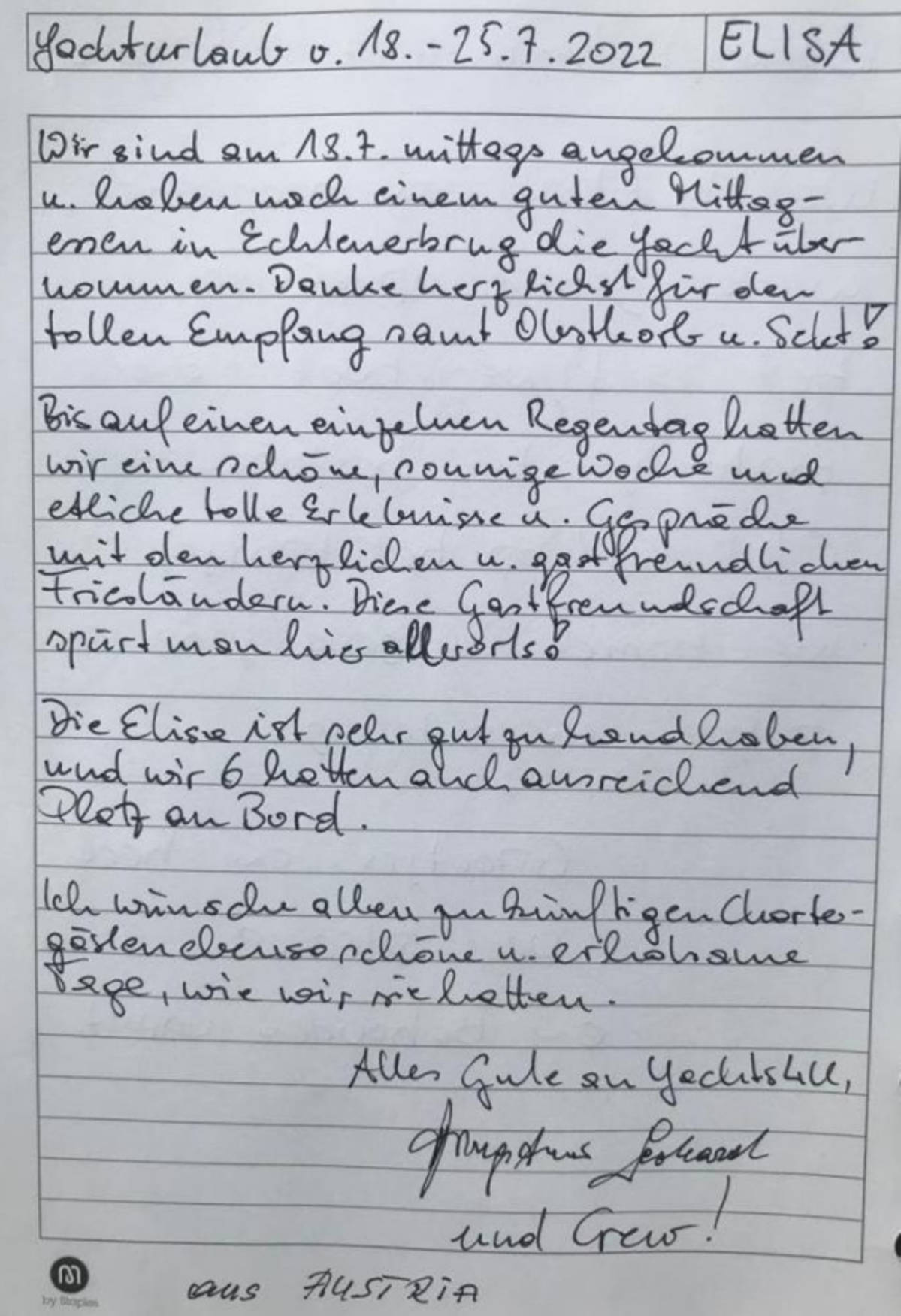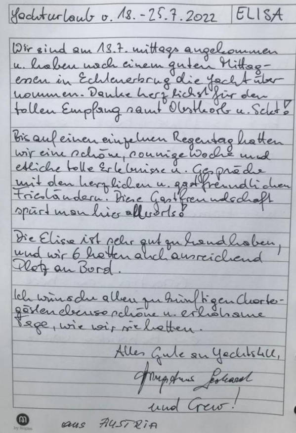 Wir wünschen allen zukünftigen Chartergästen ebenso schöne u. erholsame Tage, wie wir sie hatten.