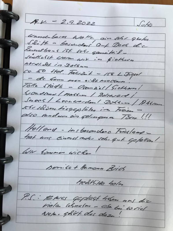 Wunderbares Wetter, ein sehr gutes Schiff- besonders auf Deck die Rundbank ist sehr gemütlich.-Sündlichst waren wir in Giethorn nördlichst in Dokkum.