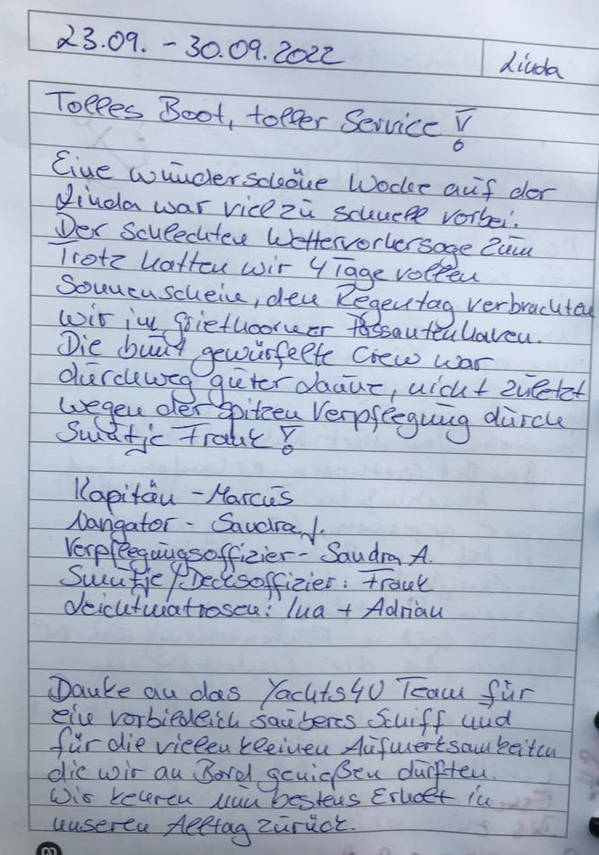 Danke an das Yachts4U -Team für ein vorbildlich sauberes Schiff und für die vielen kleinen Aufmerksamkeiten die wir an Bord genießen durften.