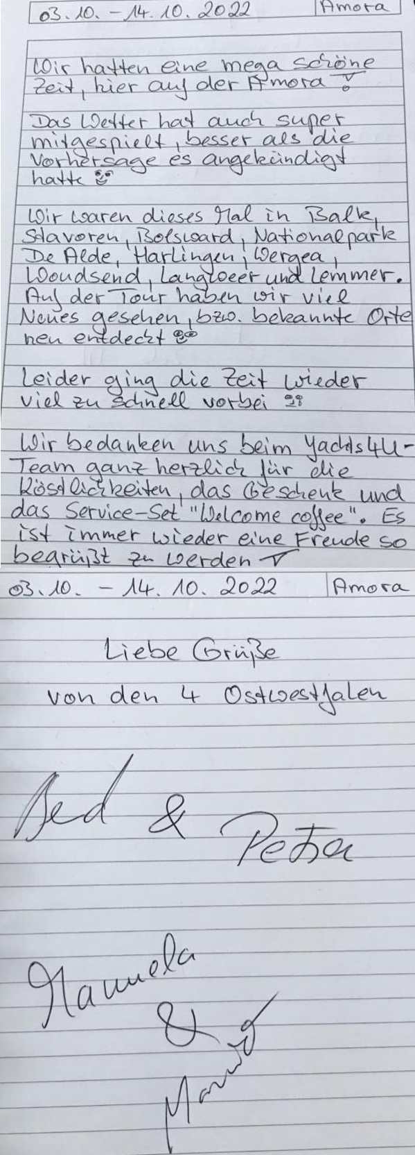 Wir bedanken uns beim Yachts 4U-Team ganz herzlich für die Köstlichkeiten, das Geschenk und das Service-Set „Welcome coffee“.