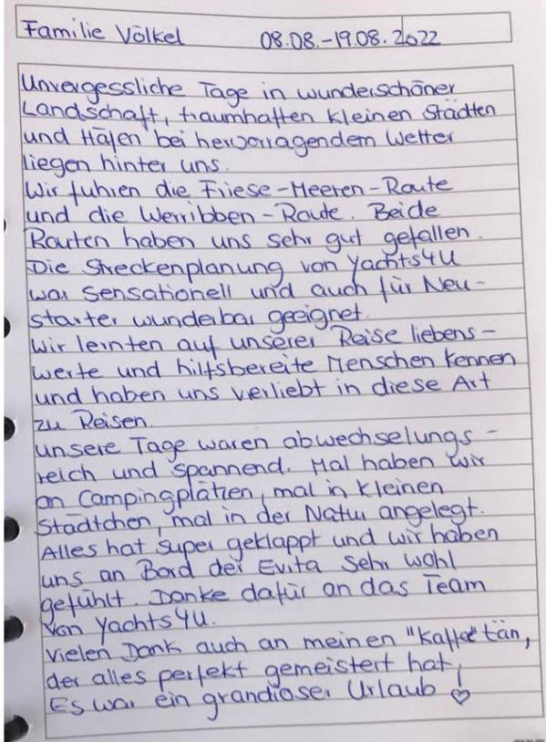 Alles hat super geklappt und wir haben uns an Bord der Evita sehr wohl gefühlt.