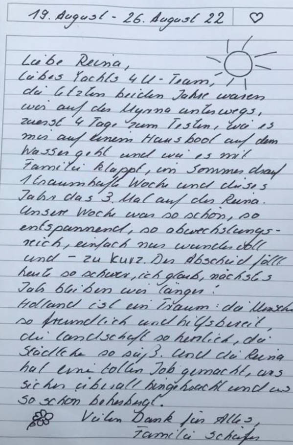 die letzten beide Jahren waren wir auf der Myrna unterwegs, zuerst 4 Tage zum Testen wie es mir auf einem Hausboot auf dem Wasser geht und wie es mit Familie klappt, im Sommer drauf 1 traumhafte Woche und dieses Jahr das 3. Mal auf der Reina.
