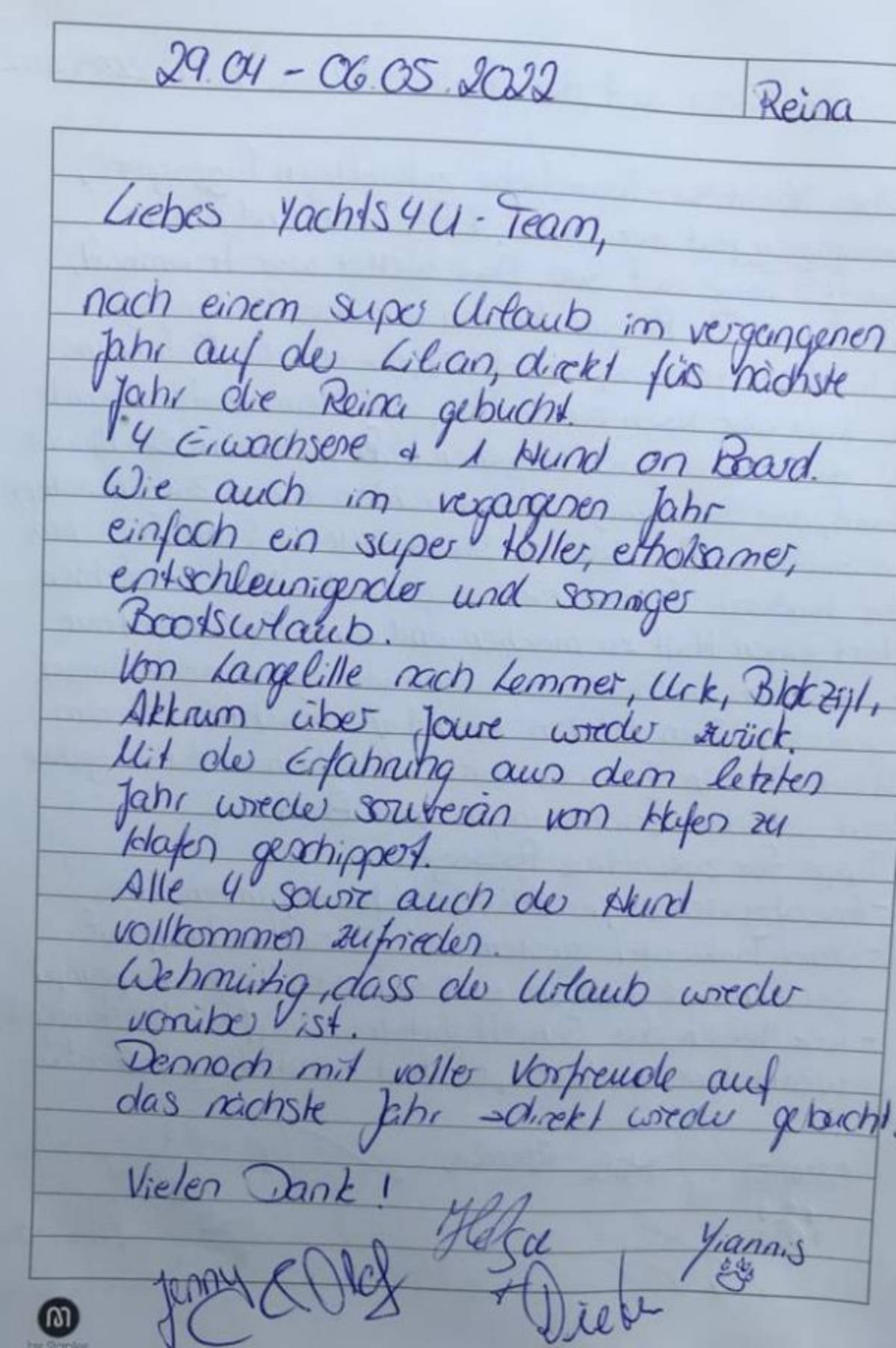 nach einem super Urlaub im vergangenen Jahr auf der Lilian, direkt fürs nächste Jahr die Reina gebucht.