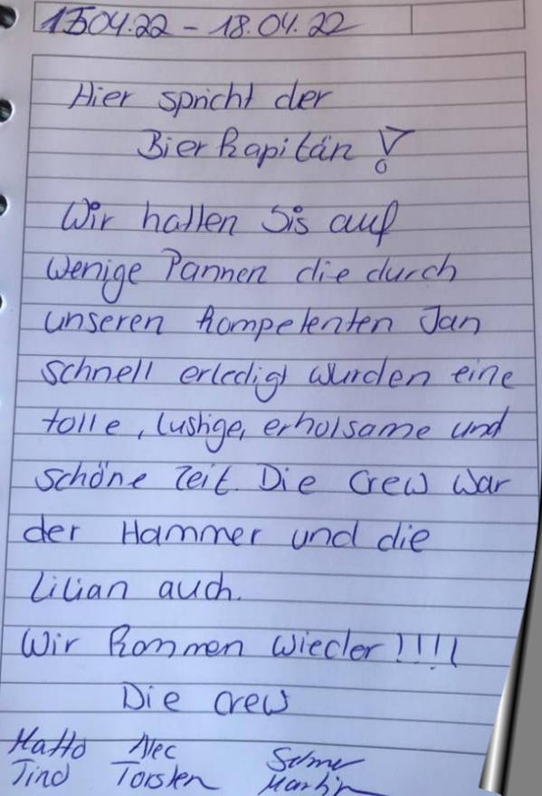 Wir hatten bis auf wenige Pannen die durch unseren kompetenten Jan schnell erledigt waren eine tolle, lustige, erholsame und schöne Zeit. Die Crew war der Hammer und die Lilian auch.