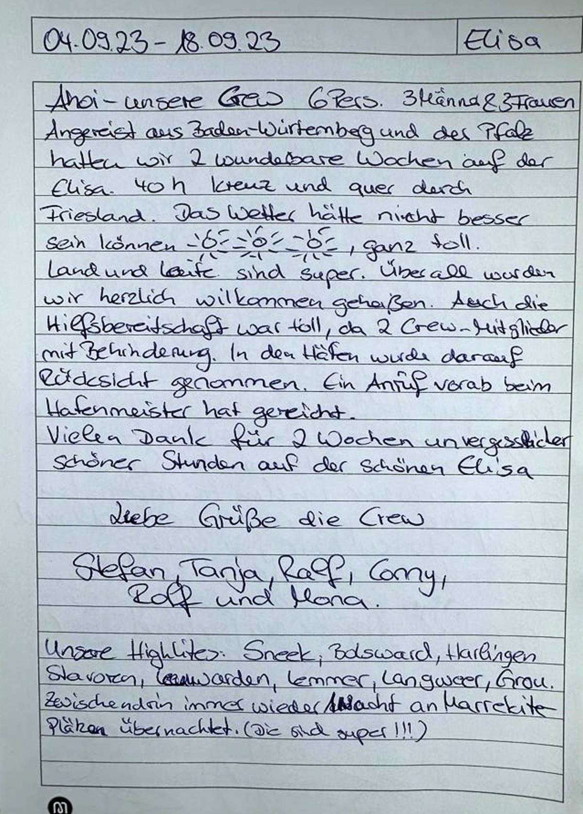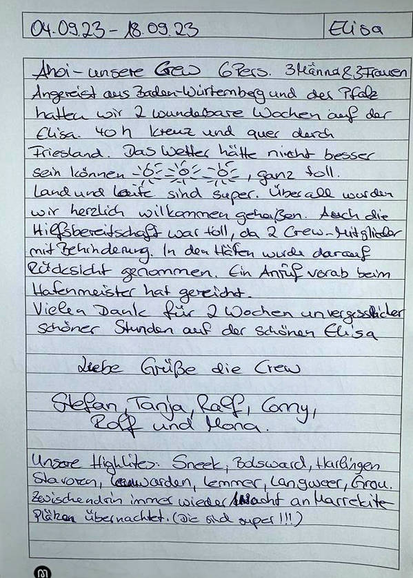 Angereist aus Baden-Würtenberg und der Pfalz hatten wir 2 wunderbare Wochen auf der Elisa. 40 h kreuz und quer durch Friesland.