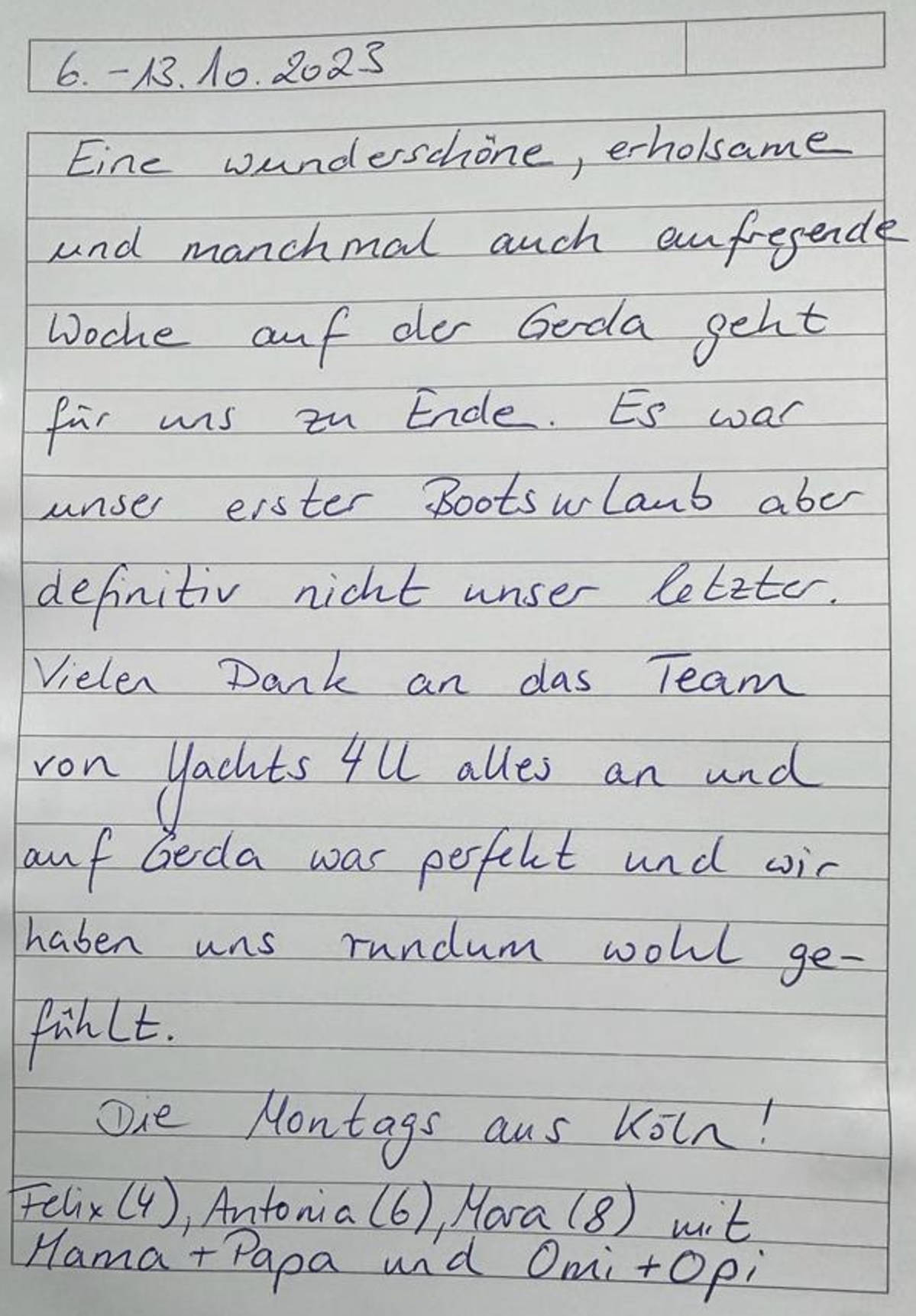 Eine wunderschöne, erholsame und manchmal auch aufregende Woche auf der Gerda geht für uns zu Ende. Es war unser erster Bootsurlaub aber definitiv nicht unser letzter. Vielen Dank an das Team von Yachts 4 U alles an und auf Gerda war perfekt und wir haben uns rundum wohl gefühlt.