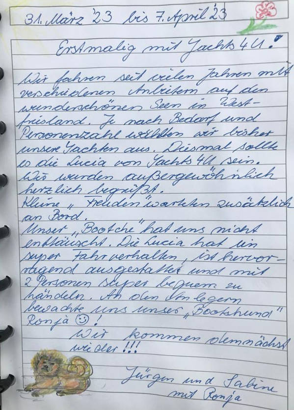Unser „Bootche“ hat uns nicht enttäuscht. Die Lucia hat ein super Fahrverhalten, ist hervorragend ausgestattet und mit 2 Personen super bequem zu händeln. An den Anlegern bewachte uns unser „Bootshund“ Ronja!