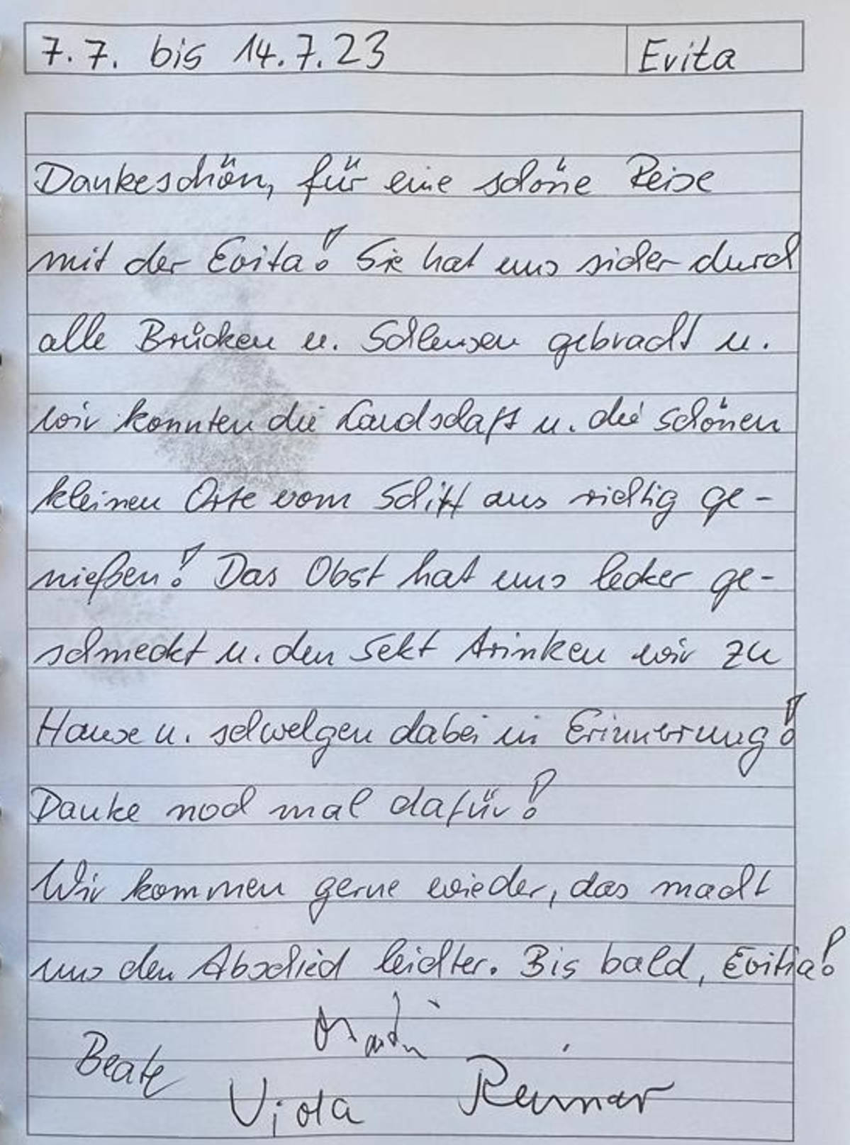 Sie hat uns sicher durch alle Brücken u. Schleusen gebracht u. wir konnten die Landschaft u. die schönen kleinen Orte vom Schiff aus richtig genießen!