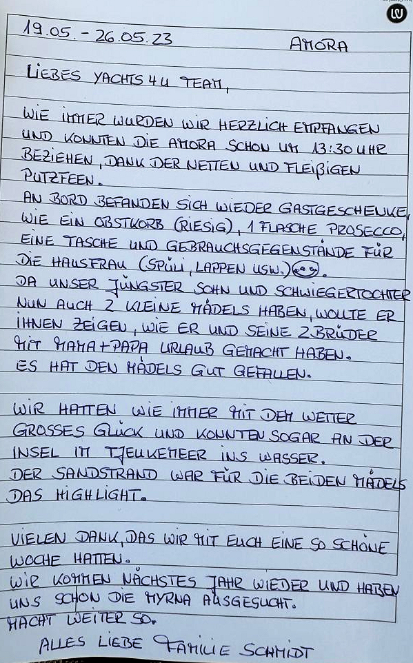Lesen Sie einen weiteren Bewertung über einen Bootsurlaub mit dem Boot Amora.