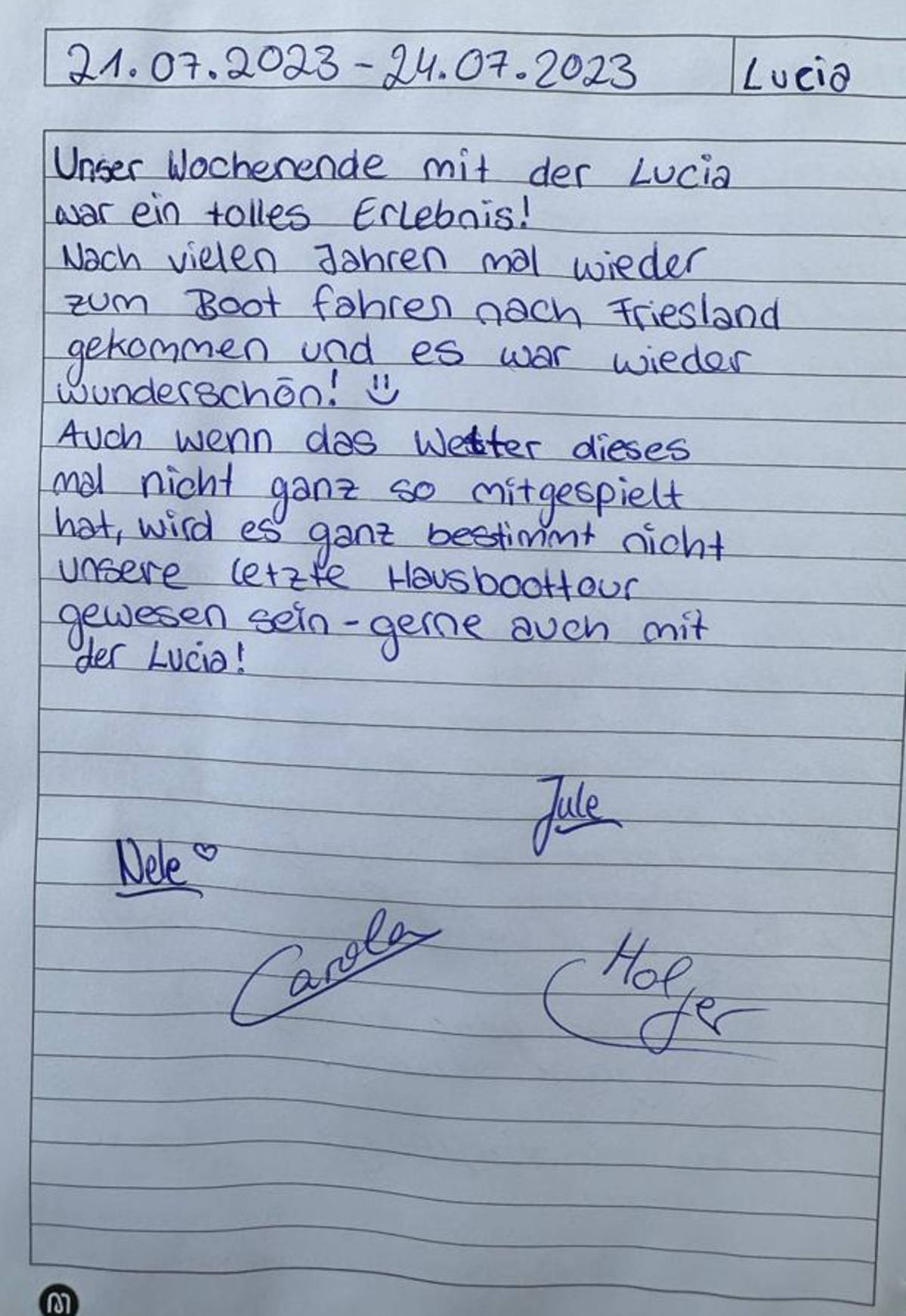 Auch wenn das Wetter dieses mal nicht gasnz so mitgespielt hat, wird es ganz bestimmt nicht unsere letzte Hausboottour gewesen sein – gerne auch mit der Lucia!