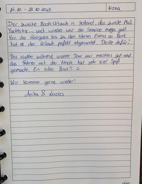 Der zweite Boots-Urlaub in Holland, das zweite Mal Yachts 4 U…. und wieder war der Service mega gut! Von der Übergabe bis zu den kleinen Extras an Bord hat es den Urlaub perfekt abgerundet. Danke dafür!