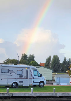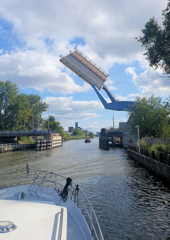 Ein Stück weiter kam Blokzijl in Sicht. Trotz der dunklen Wolken konnten wir bei Sonnenschein in Blokzijl einfahren. Die Schleusung dauerte eine Weile, also legten wir am Warteplatz vor der Schleuse an. Schließlich bekamen wir das Lichtsignal, um uns für die Schleusung bereit zu machen, und fuhren dann weiter, um im Hafenbecken von Blokzijl festzumachen.
