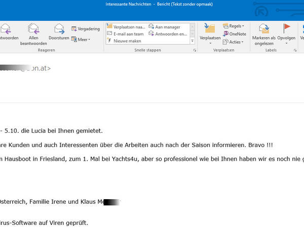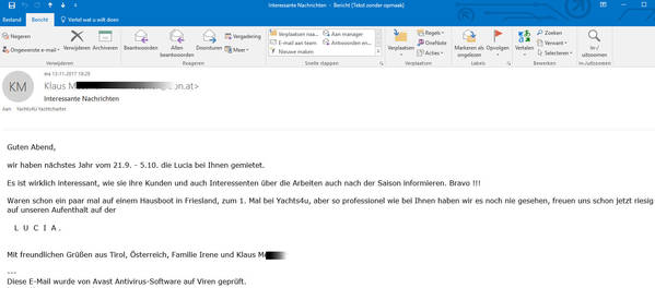 Wir freuen uns über eine E-Mail, wie Sie unten sehen. Es geht nicht darum, ein Boot zu mieten. Nicht über Segeln in Friesland. Aber über unsere News-Seite.