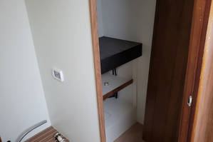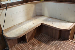 Wo sich im Salon der Innensteuerstand befand, befindet sich jetzt eine neue L-förmige Sitzbank. Im Salon stehen sich nun 2 Sofas gegenüber. Im Salon gibt es auch 2 Tische, die zusammengeschoben werden können, um den verfügbaren Platz im Innenraum zu maximieren.