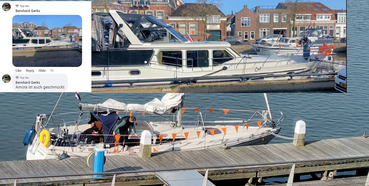 Der Mieter auf der Amora ließ uns wissen, dass er mit seiner Gesellschaft an Bord das Boot in den orangen Königsfarben geschmückt hatte.