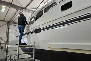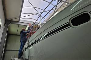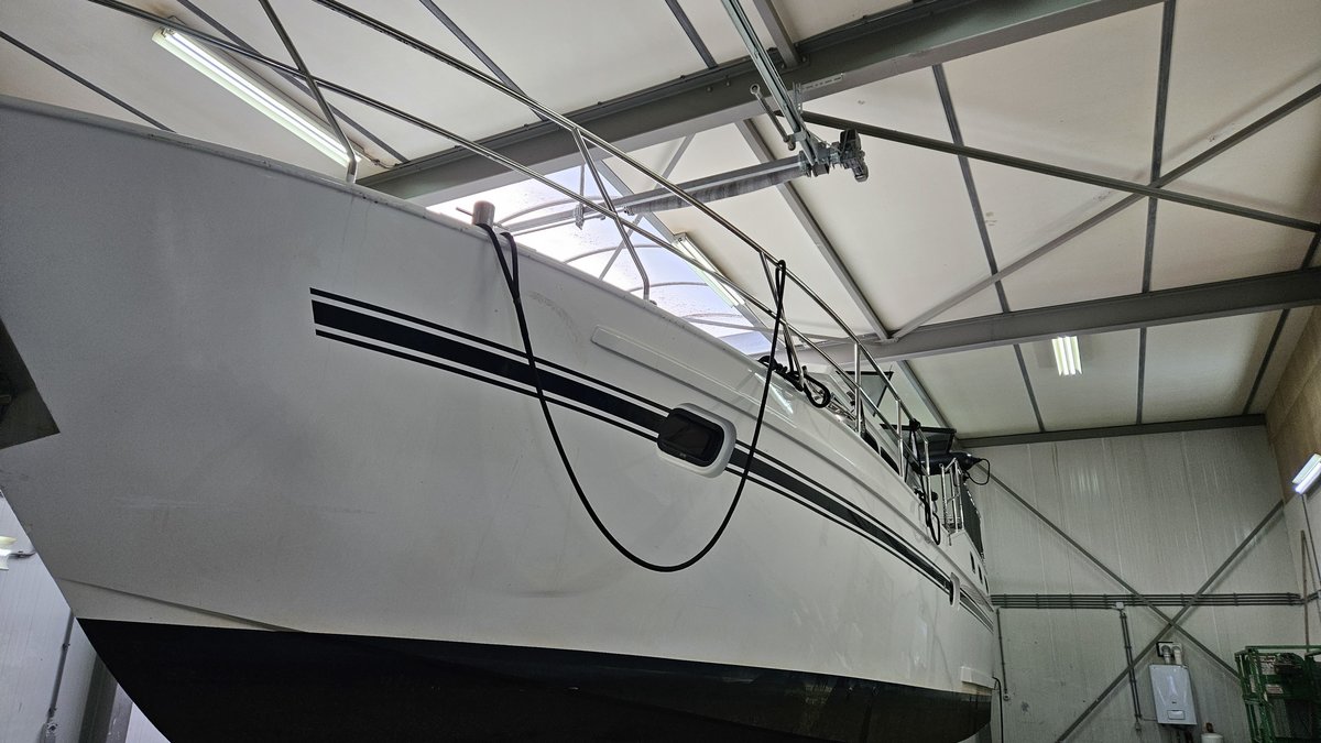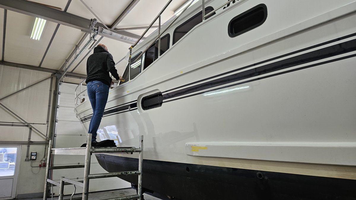 Derzeit liegt der Schwerpunkt auf den Vorbereitungen zum Lackieren der Aufbauten, des Rumpfes und des Unterwasserschiff des Bootes. Die Sprayhood und alle Fenster werden entfernt. Das Ganze wird fettfrei gemacht, geschliffen und mögliche Schäden werden repariert.